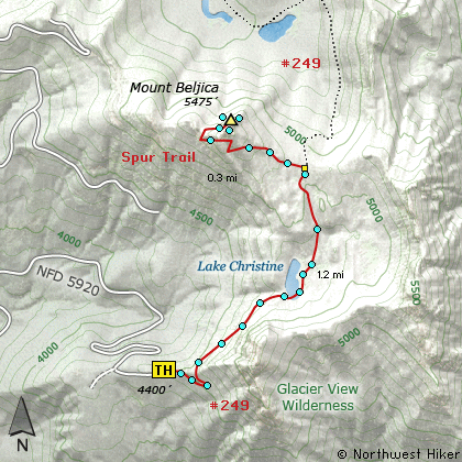 From Ashford travel east on highway 706 for about 3 miles. Turn left (north) onto Forest Road 59. At 4.1 miles you will pass Forest Road 5920 which goes to the trailhead for Lake Christine. Bear right on FS 5920 for another mile to the trailhead for this hike.
