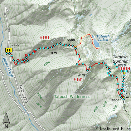 Travel east on US Hwy 12 for about 64 miles to Packwood. As you eastbound on US Hwy 12 through Packwood, near the east end of the town, you will come to the junction of Forest Road 52 on your left. Follow FR52 west across the Cowlitz River, and uphill out of the valley for about 4.1 miles. You will then come to the junction with Forest Road 5270 on your right. Bear right and follow FR5270 for about 5.6 miles where it is just about to cross Butter Creek. Bear right onto Forest Road 5272 and follow this road for about 1.4 miles and you will find the trailhead for both Tatoosh Wilderness hikes on your right.