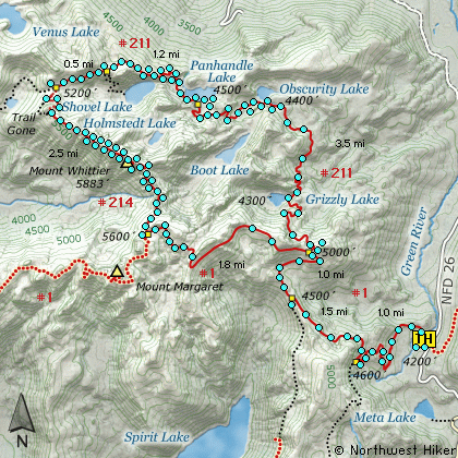 ATTENTION:  Please note that this hike description includes the traverse of the Mt Whittier ridge line. There is NOT a useable trail along this ridge. Weather and time have destroyed any sense of an adequate trail in this area. In places there are not safe ways across steep areas, and therefore the hiker must scramble with no visible trail. Travel this area entirely at your own risk. Northwest Hiker takes no responsibility for your safety and does NOT encourage anyone to attempt this traverse.