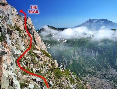 Upon reaching the junction to Trail #211, turn and continue climbing to the ridge, which is called Bear Pass. This ridge is a worthy hike in itself. From Bear Pass you have excellent views of Mt Rainier to the north, Mt Adams to the east, Mt Hood to the south, and of course you are staring into the throat of Mt St Helens.