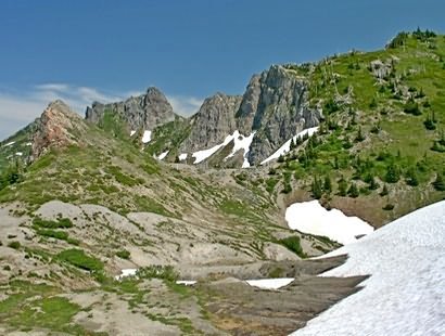 trail breaks over the ridge so you can see Mt. Whittier and Mt. Rainier
