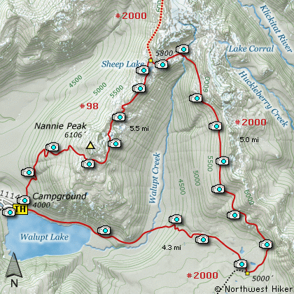 and up a steep hill for another 5.2 miles to Walupt Lake. There is a campground on