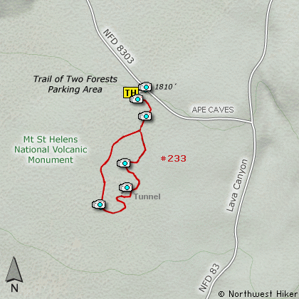 to the Trail of Two Forests Interpretive Site. Turn left on FR8303 and follow it for