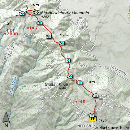 As soon as you meet the PCT, you will leave it by follow a spur trail to the right which leads to the top of Big Huckleberry Mountain.