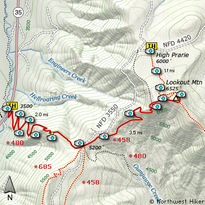 Having said that, note that the map shows another approach to Lookout Mtn from the north. This is the High Prairie Trail head and is obviously a much short and less vigorous hike.